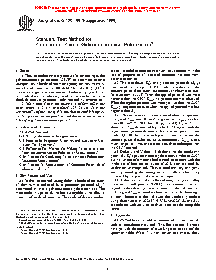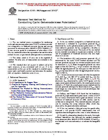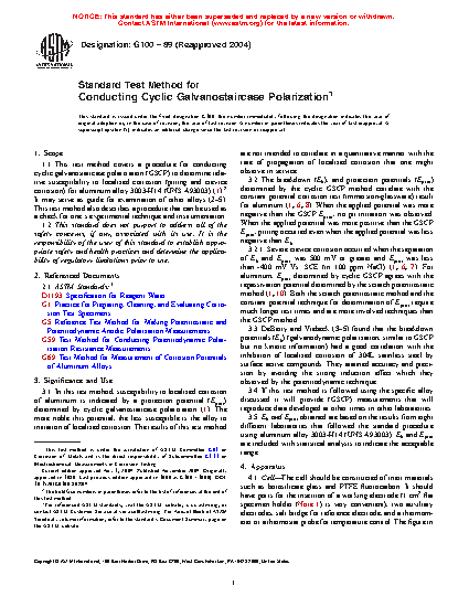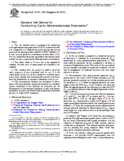 1.1 This test method covers a procedure for conducting cyclic galvanostaircase polarization (GSCP) to determine relative susceptibility to localized corrosion (pitting and crevice corrosion) for aluminum alloy 3003-H14 (UNS A93003) (1).2 It may serve as guide for examination of other alloys (2-5). This test method also describes a procedure that can be used as a check for one's experimental technique and instrumentation.