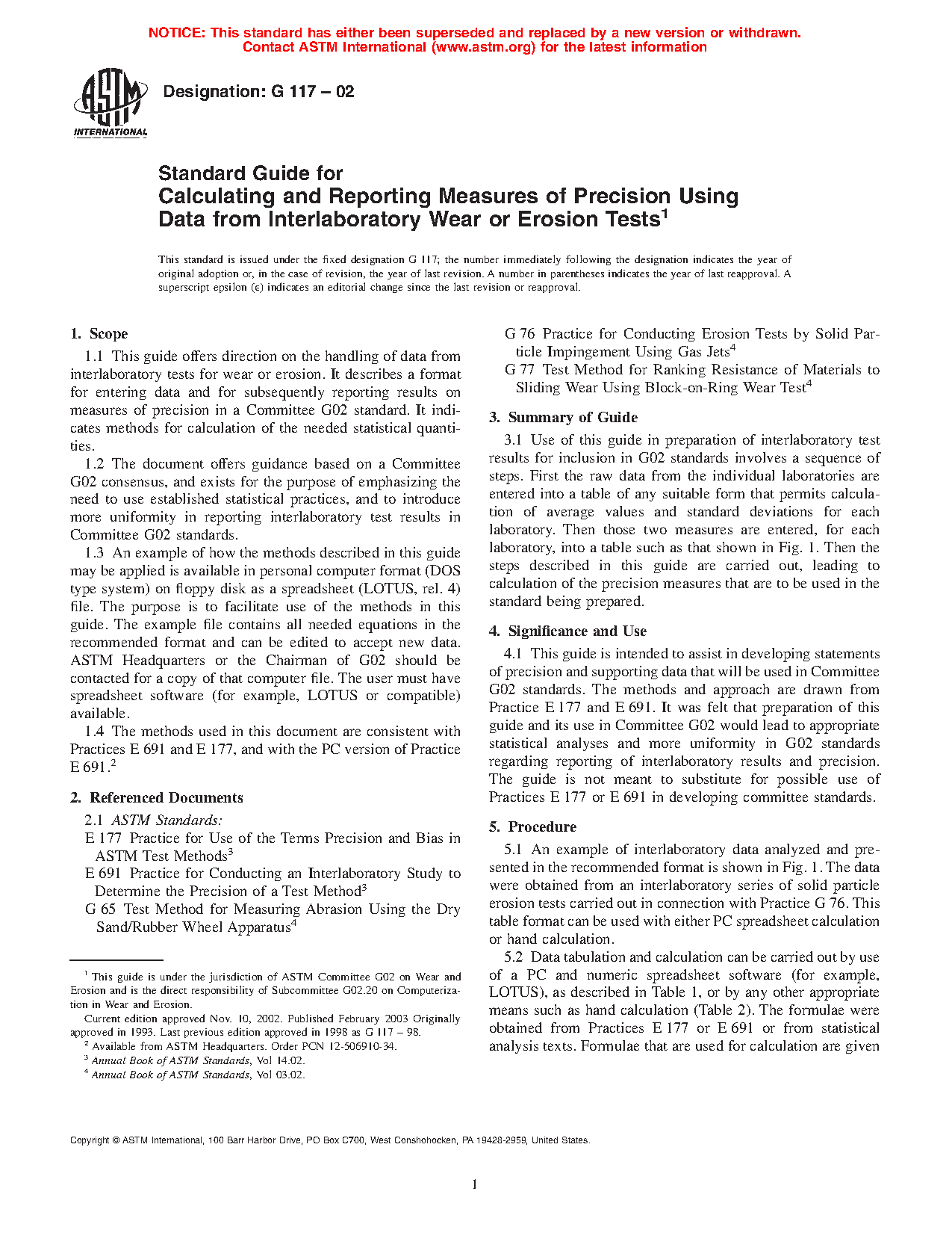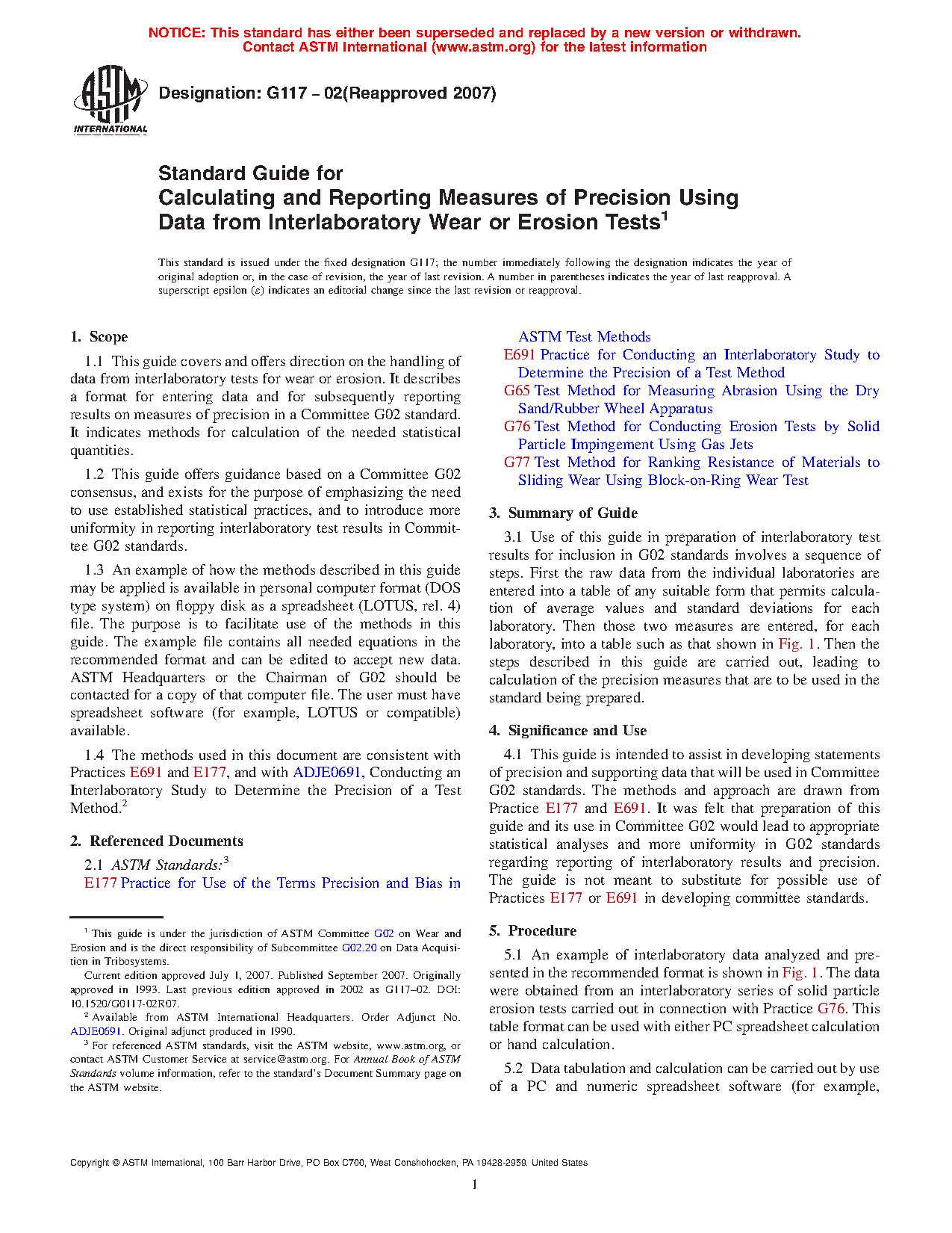 1.1 This guide offers direction on the handling of data from interlaboratory tests for wear or erosion. It describes a format for entering data and for subsequently reporting results on measures of precision in a Committee G02 standard. It indicates methods for calculation of the needed statistical quantities.
