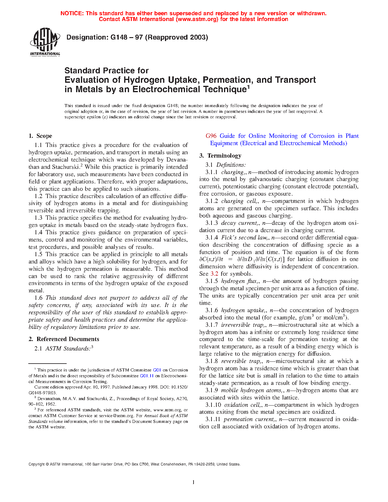 1.1 This practice gives a procedure for the evaluation of hydrogen uptake, permeation, and transport in metals using an electrochemical technique which was developed by Devanathan and Stachurski. While this practice is primarily intended for laboratory use, such measurements have been conducted in field or plant applications. Therefore, with proper adaptations, this practice can also be applied to such situations.