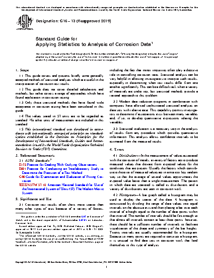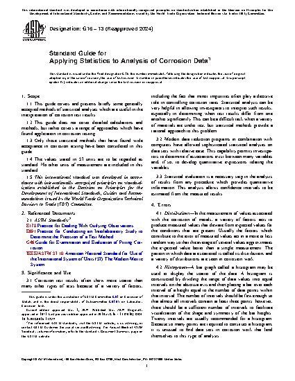 1.1 This guide covers and presents briefly some generally accepted methods of statistical analyses which are useful in the interpretation of corrosion test results.