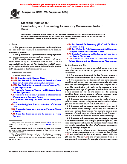 Note 1: The corrosivity of soils strongly depends on soluble salt content (related parameters are chemistry and soil resistivity, see Test Methods G57 and G187), acidity or alkalinity (measured by soil pH, see Test Method G51), Temperature, and oxygen content (loose, for example, sand, or compact, for example, clay, soils are extreme examples, see Test Method G200 – oxidation-reduction potential). The manufacturer, supplier, or user, or combination thereof, should establish the nature of the expected soil environment(s) and select the test environment(s) accordingly. Multiple types of soil can be used to determine the effect of this variable.