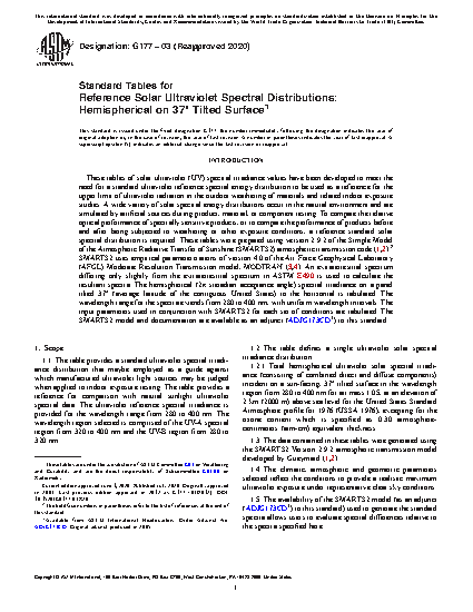 1.1 The table provides a standard ultraviolet spectral irradiance distribution that maybe employed as a guide against which manufactured ultraviolet light sources may be judged when applied to indoor exposure testing. The table provides a reference for comparison with natural sunlight ultraviolet spectral data. The ultraviolet reference spectral irradiance is providded for the wavelength range from 280 to 400 nm. The wavelength region selected is comprised of the UV-A spectral region from 320 to 400 nm and the UV-B region from 280 to 320 nm.