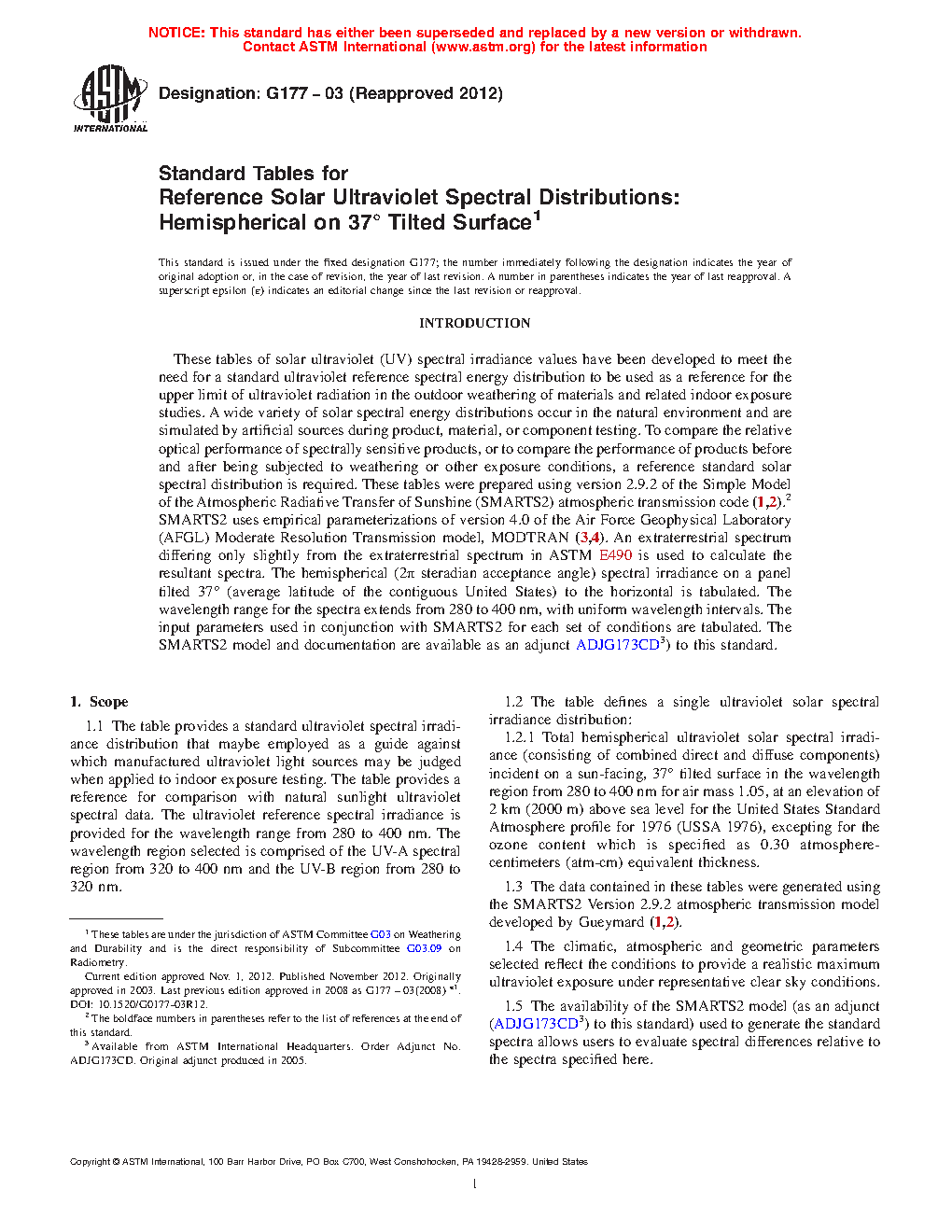 1.5 The availability of the SMARTS2 model (as an adjunct to this standard) used to generate the standard spectra allows users to evaluate spectral differences relative to the spectra specified here.