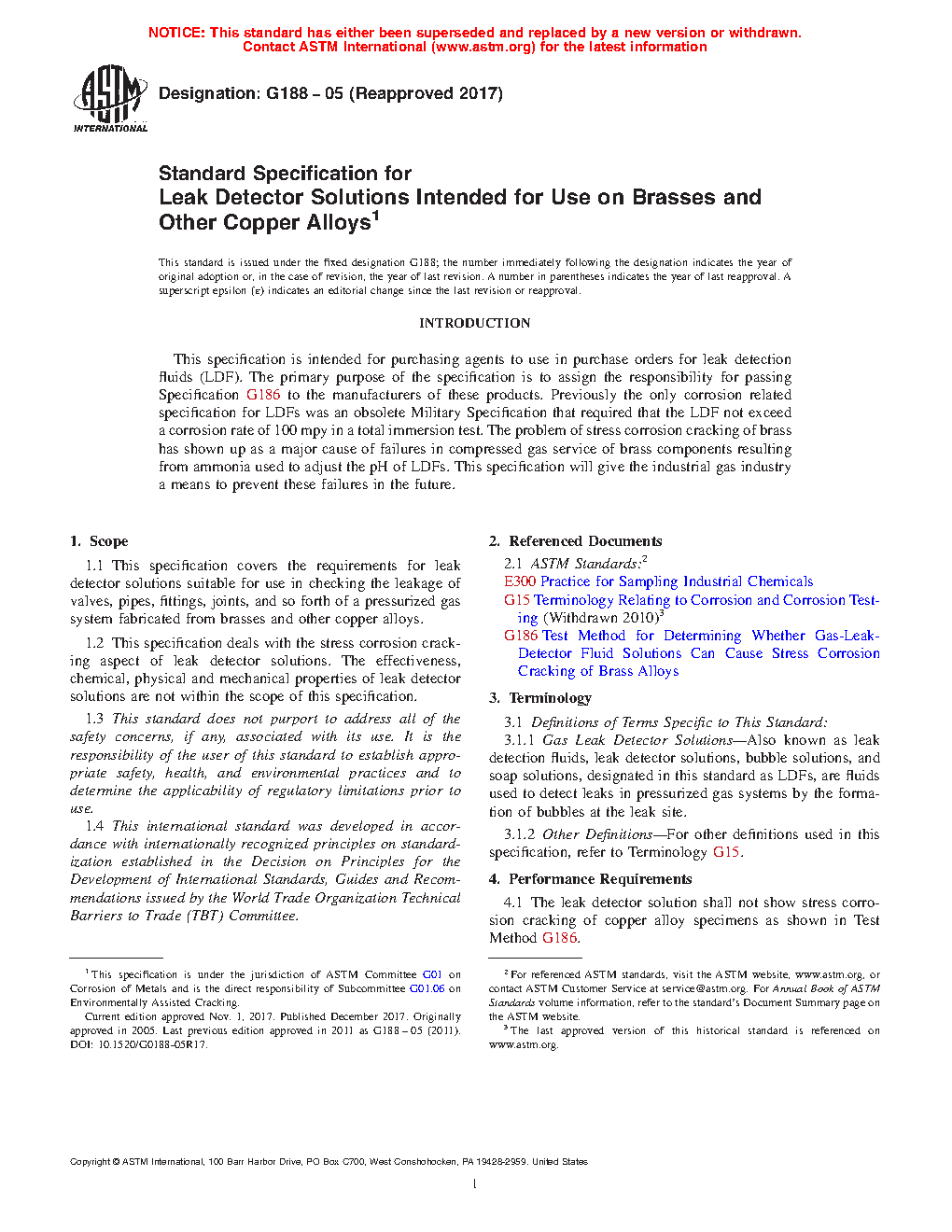 1.1 This specification covers the requirements for leak detector solutions suitable for use in checking the leakage of valves, pipes, fittings, joints, and so forth of a pressurized gas system fabricated from brasses and other copper alloys.