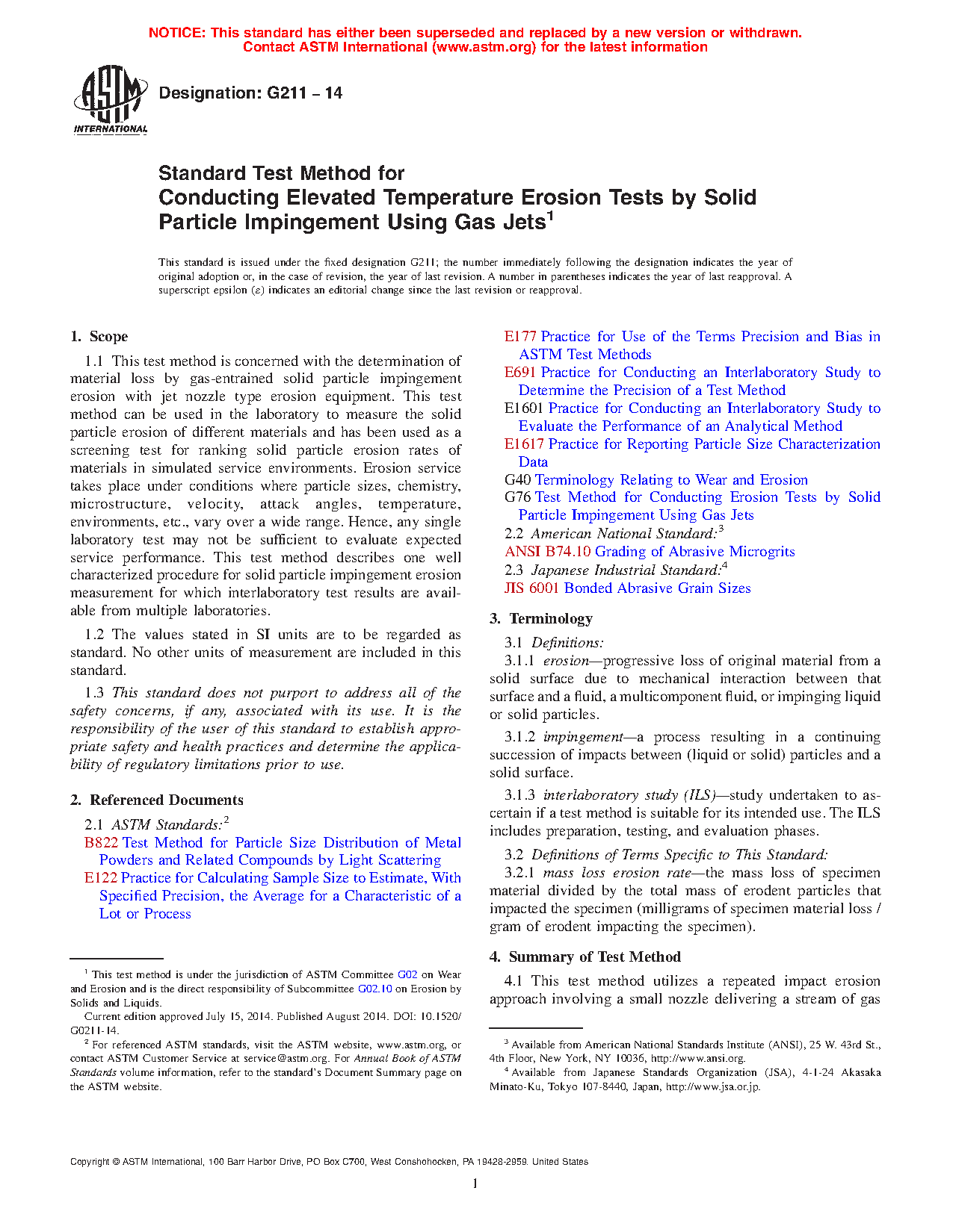 1.1 This test method is concerned with the determination of material loss by gas-entrained solid particle impingement erosion with jet nozzle type erosion equipment. This test method can be used in the laboratory to measure the solid particle erosion of different materials and has been used as a screening test for ranking solid particle erosion rates of materials in simulated service environments. Erosion service takes place under conditions where particle sizes, chemistry, microstructure, velocity, attack angles, temperature, environments, etc., vary over a wide range. Hence, any single laboratory test may not be sufficient to evaluate expected service performance. This test method describes one well characterized procedure for solid particle impingement erosion measurement for which interlaboratory test results are available from multiple laboratories.