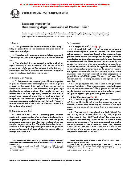 1.1 This practice covers the determination of the susceptibility of plastic films to the attachment and proliferation of surface-growing algae.