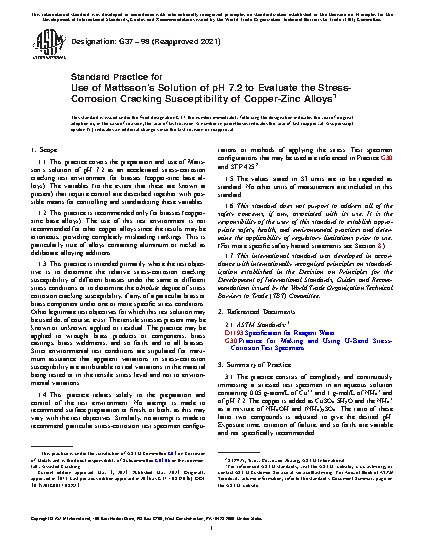1.1 This practice covers the preparation and use of Mattsson’s solution of pH 7.2 as an accelerated stress-corrosion cracking test environment for brasses (copper-zinc base alloys). The variables (to the extent that these are known at present) that require control are described together with possible means for controlling and standardizing these variables.