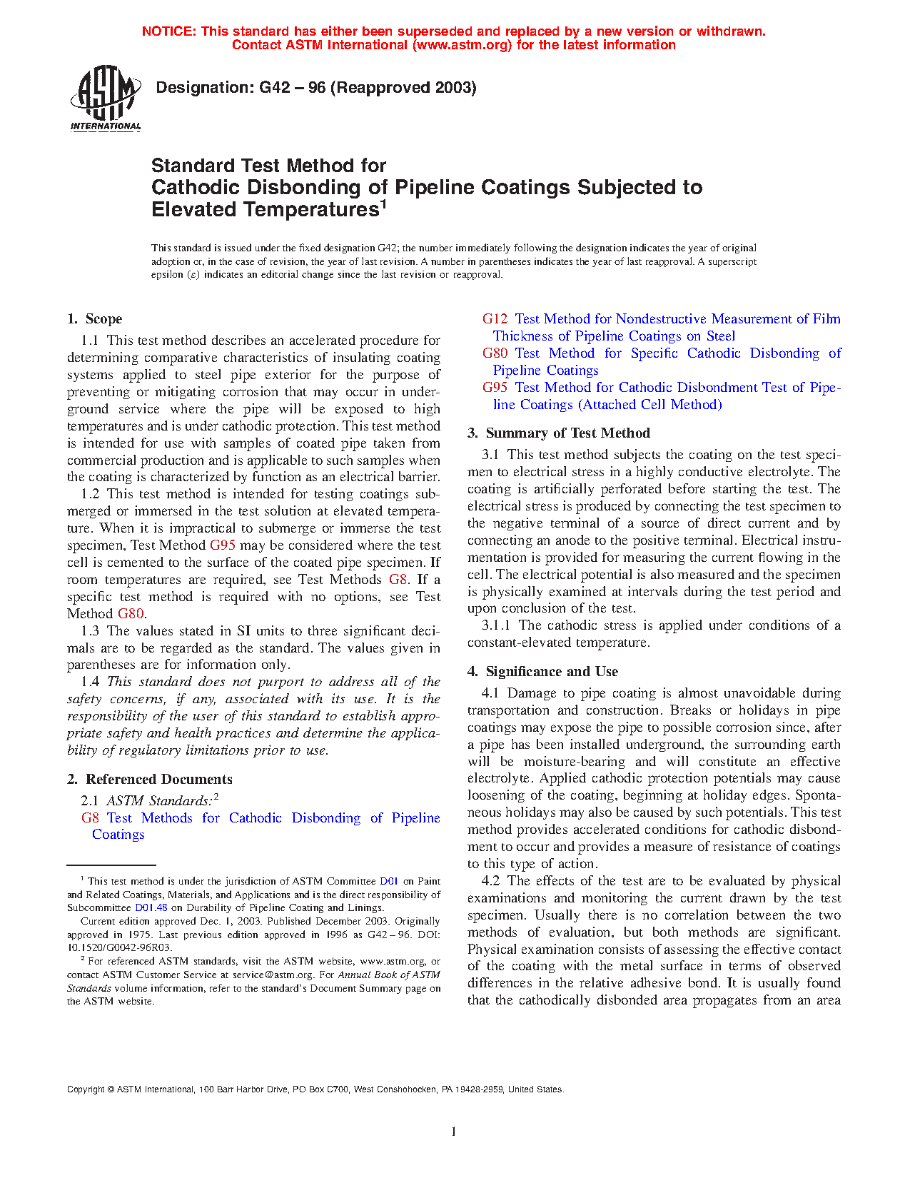 1.1 This test method describes an accelerated procedure for determining comparative characteristics of insulating coating systems applied to steel pipe exterior for the purpose of preventing or mitigating corrosion that may occur in underground service where the pipe will be exposed to high temperatures and is under cathodic protection. This test method is intended for use with samples of coated pipe taken from commercial production and is applicable to such samples when the coating is characterized by function as an electrical barrier.