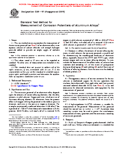 1.1 This test method covers a procedure for measurement of the corrosion potential (see Note 1) of an aluminum alloy in an aqueous solution of sodium chloride with enough hydrogen peroxide added to provide an ample supply of cathodic reactant.