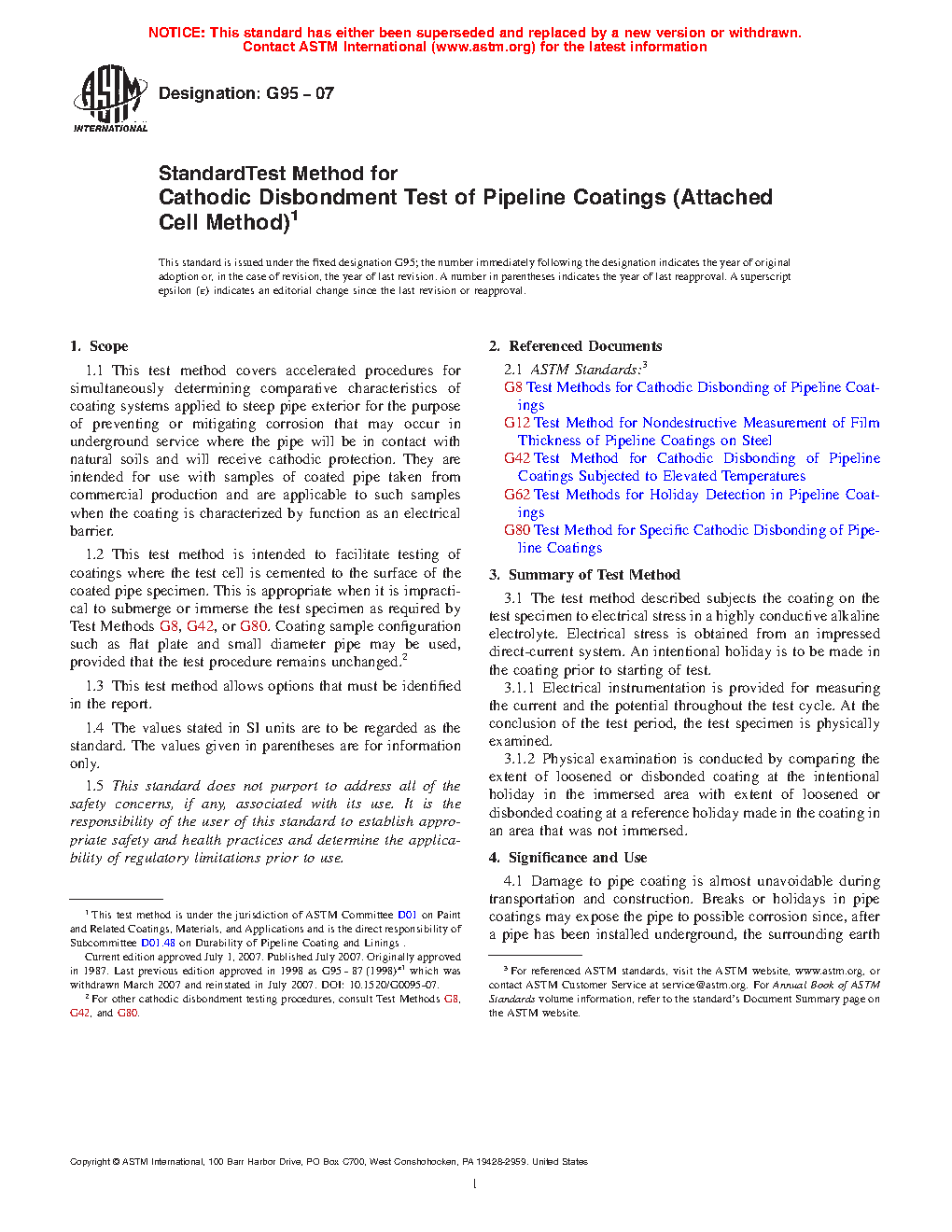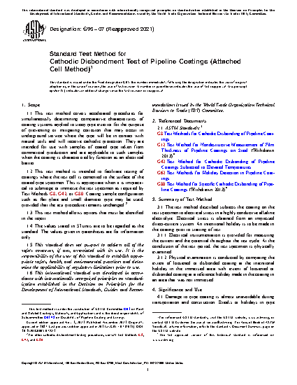 1.2 This test method is intended to facilitate testing of coatings where the test cell is cemented to the surface of the coated pipe specimen. This is appropriate when it is impractical to submerge or immerse the test specimen as required by Test Methods G8, G42, or G80. Coating sample configuration such as flat plate and small diameter pipe may be used, provided that the test procedure remains unchanged.2