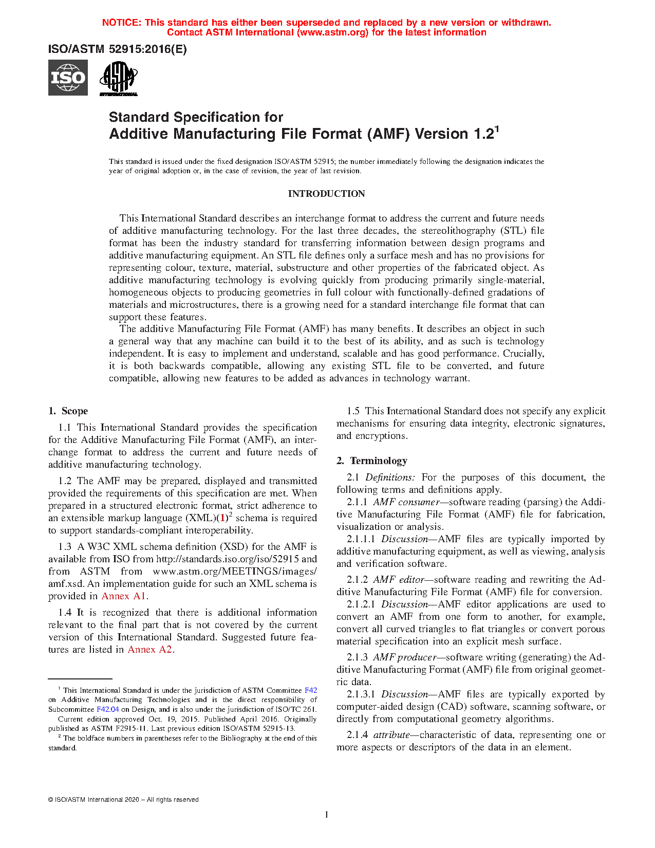 1.1 This document provides the specification for the Additive Manufacturing File Format (AMF), an interchange format to address the current and future needs of additive manufacturing technology.