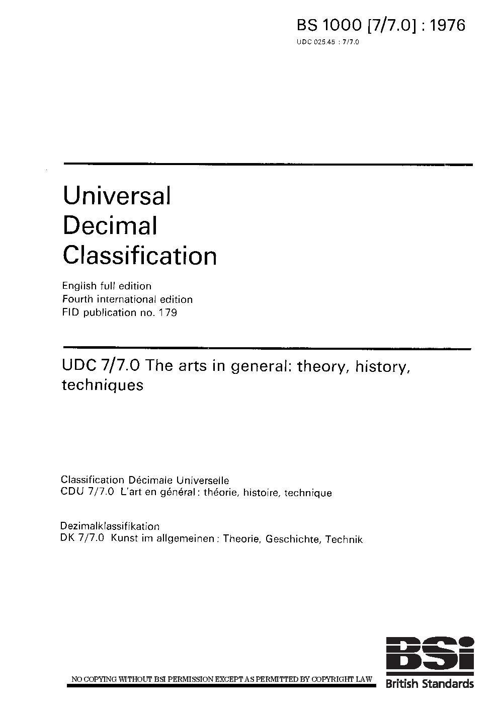 Universal Decimal Classification. English full edition The arts in general: theory, history, techniques