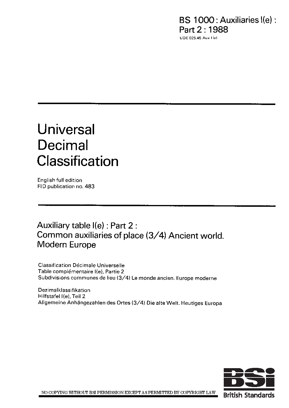 Universal Decimal Classification. English full edition. Auxiliary table I(e) Common auxiliaries of place (3/4) Ancient world. Modern Europe