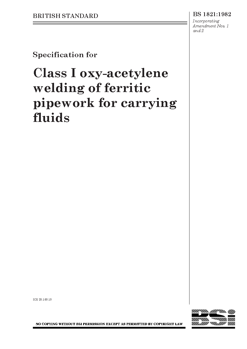 Specification for class I oxy-acetylene welding of ferritic steel pipework for carrying fluids