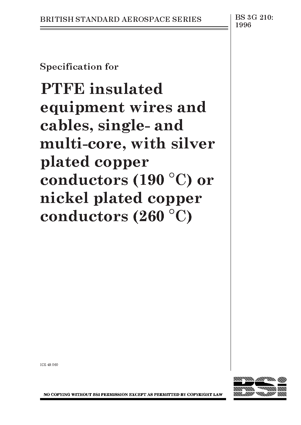 Specification for PTFE insulated equipment wires and cables, single- and multi-core, with silver plated copper conductors (190°C) or nickel plated copper conductors (260°C)