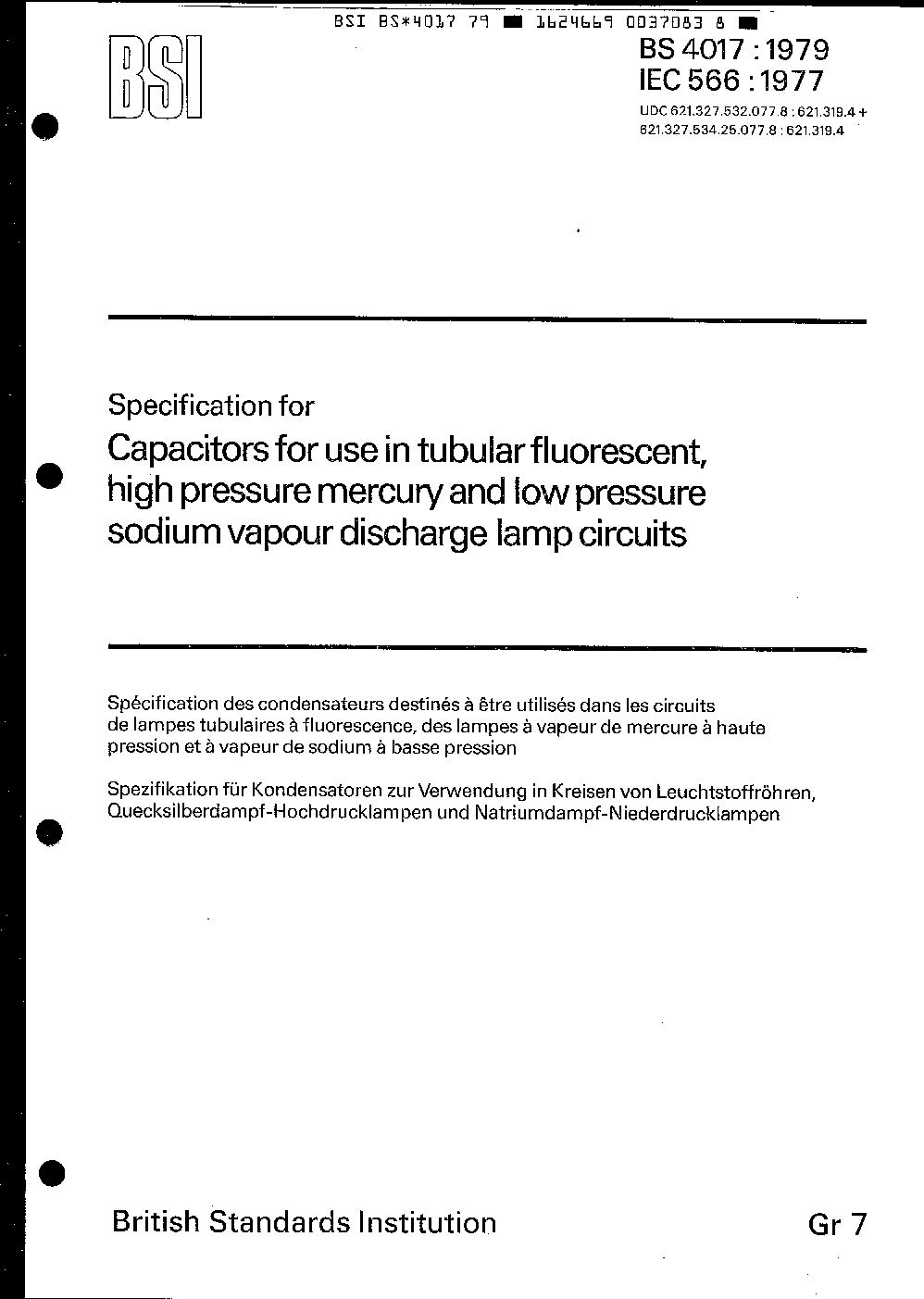 Specification for capacitors for use in tubular fluorescent, high pressure mercury and low pressure sodium vapour lamp circuits