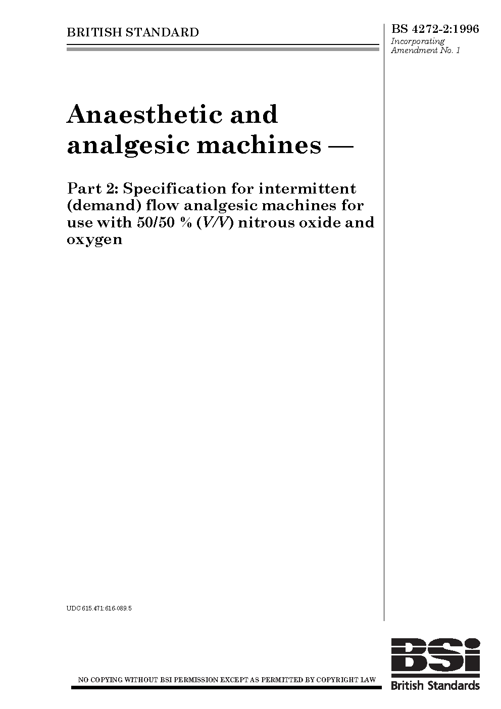 Anaesthetic and analgesic machines Specification for intermittent (demand) flow use with 50/50% (V/V) nitrous oxide oxygen
