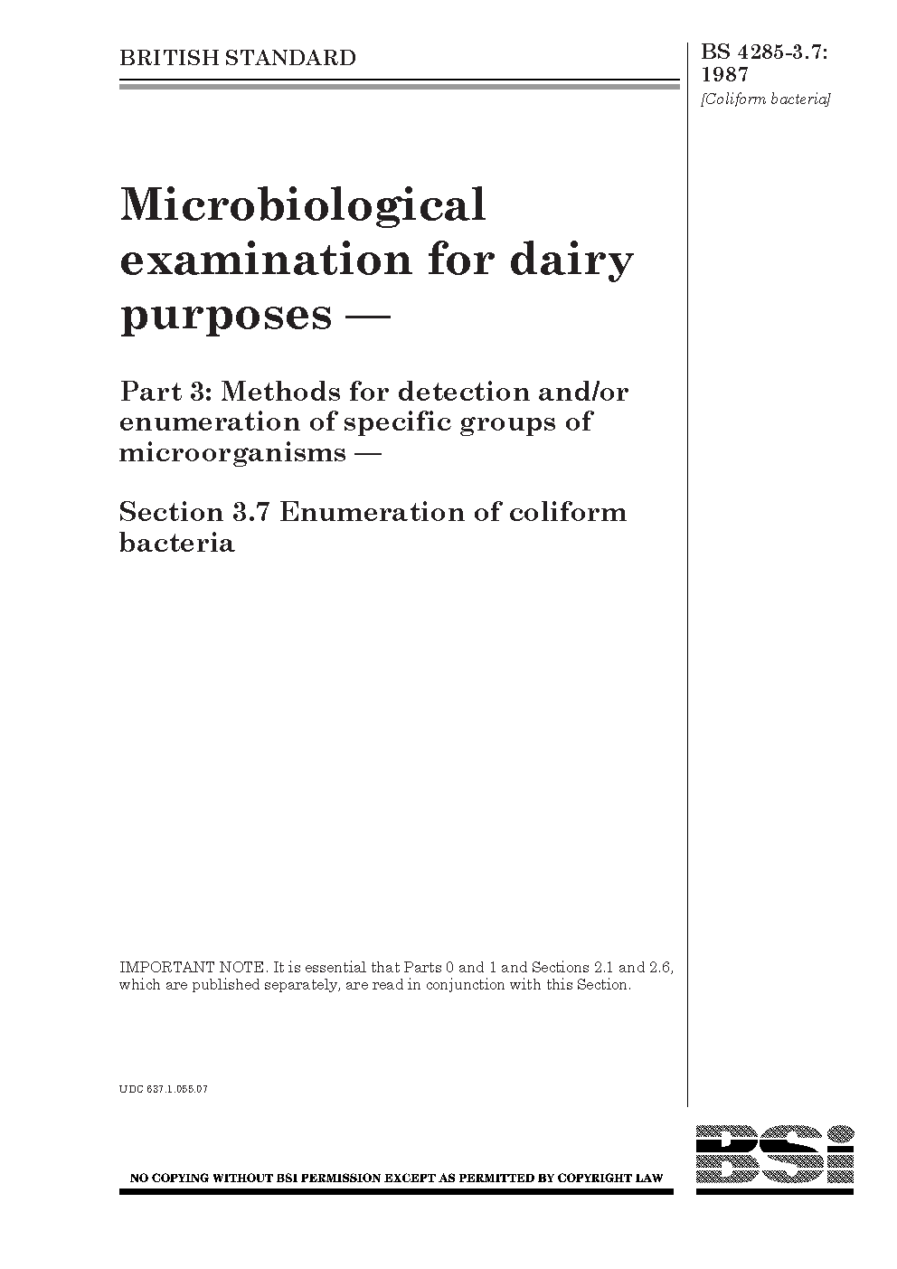 Microbiological examination for dairy purposes. Methods detection and/or enumeration of specific groups microorganisms Enumeration coliform bacteria