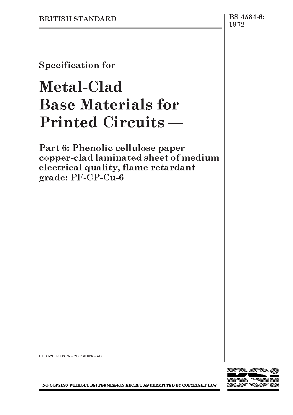 Specification for metal-clad base materials printed circuits Phenolic cellulose paper copper-clad laminated sheet of medium electrical quality, flame retardant grade: PF-CP-Cu-6