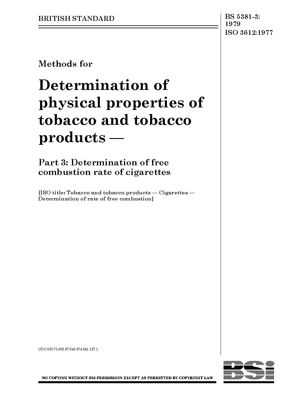 Methods for determination of physical properties tobacco and products Determination free combustion rate cigarettes