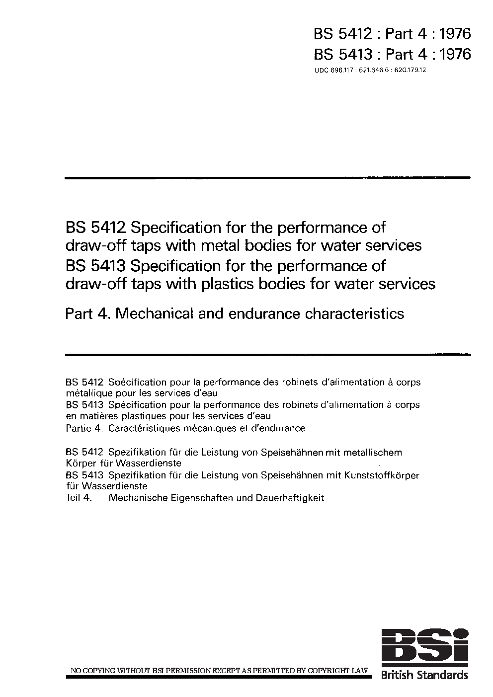 Specification for the performance of draw-off taps with metal bodies water services Mechanical and endurance characteristics