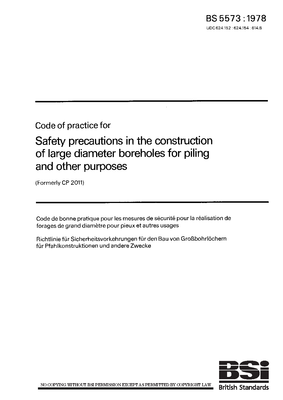 Code of practice for safety precautions in the construction of large diameter boreholes for piling and other purposes