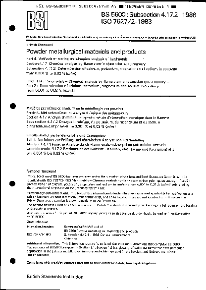 Powder metallurgical materials and products. Methods of testing chemical analysis hardmetals. Chemical by flameatomic absorption spectrometry Determination calcium, potassium, magnesium sodium in contents from 0.001 to 0.02% (m/m)