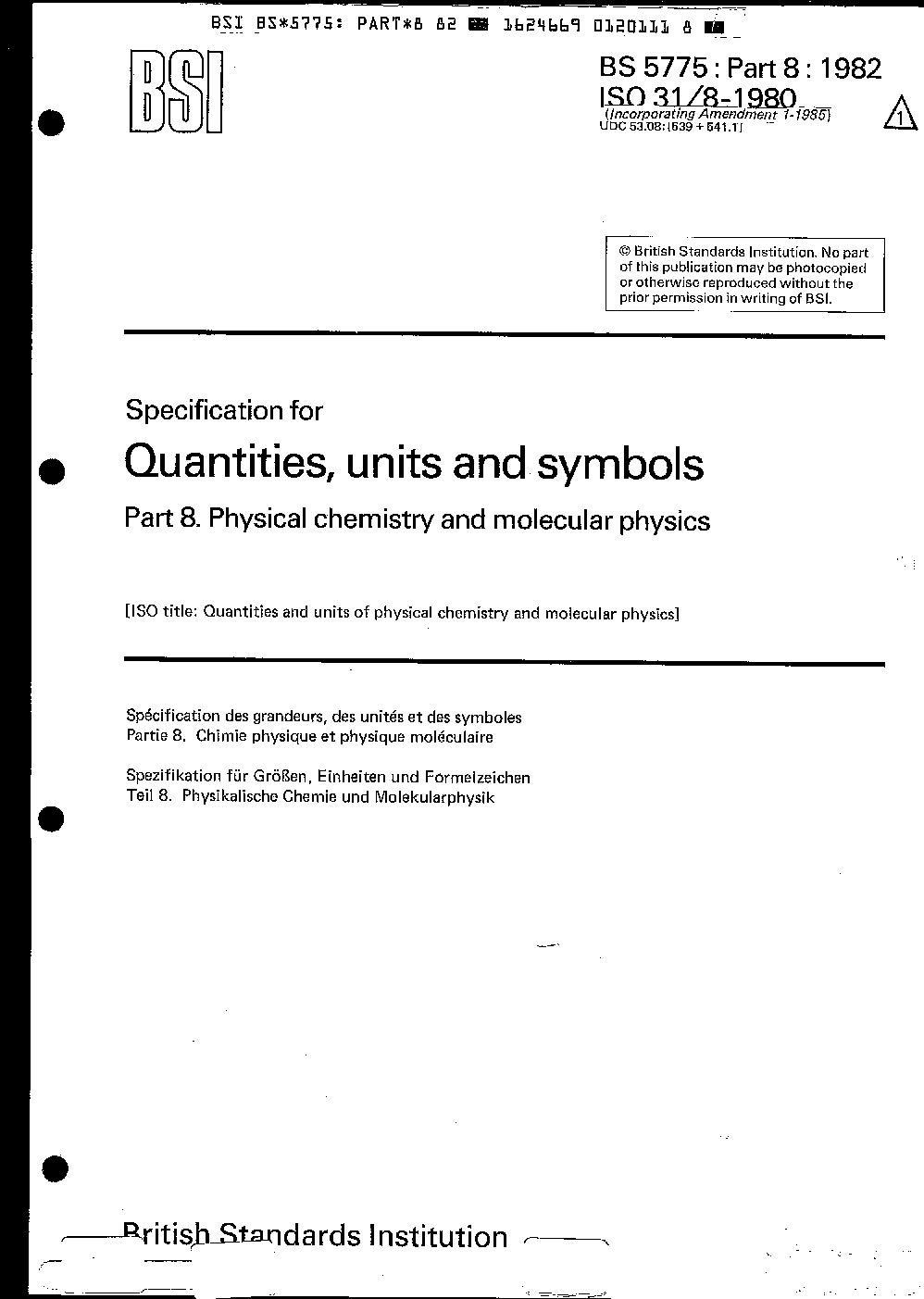 Specification for quantities, units and symbols Physical chemistry molecular physics