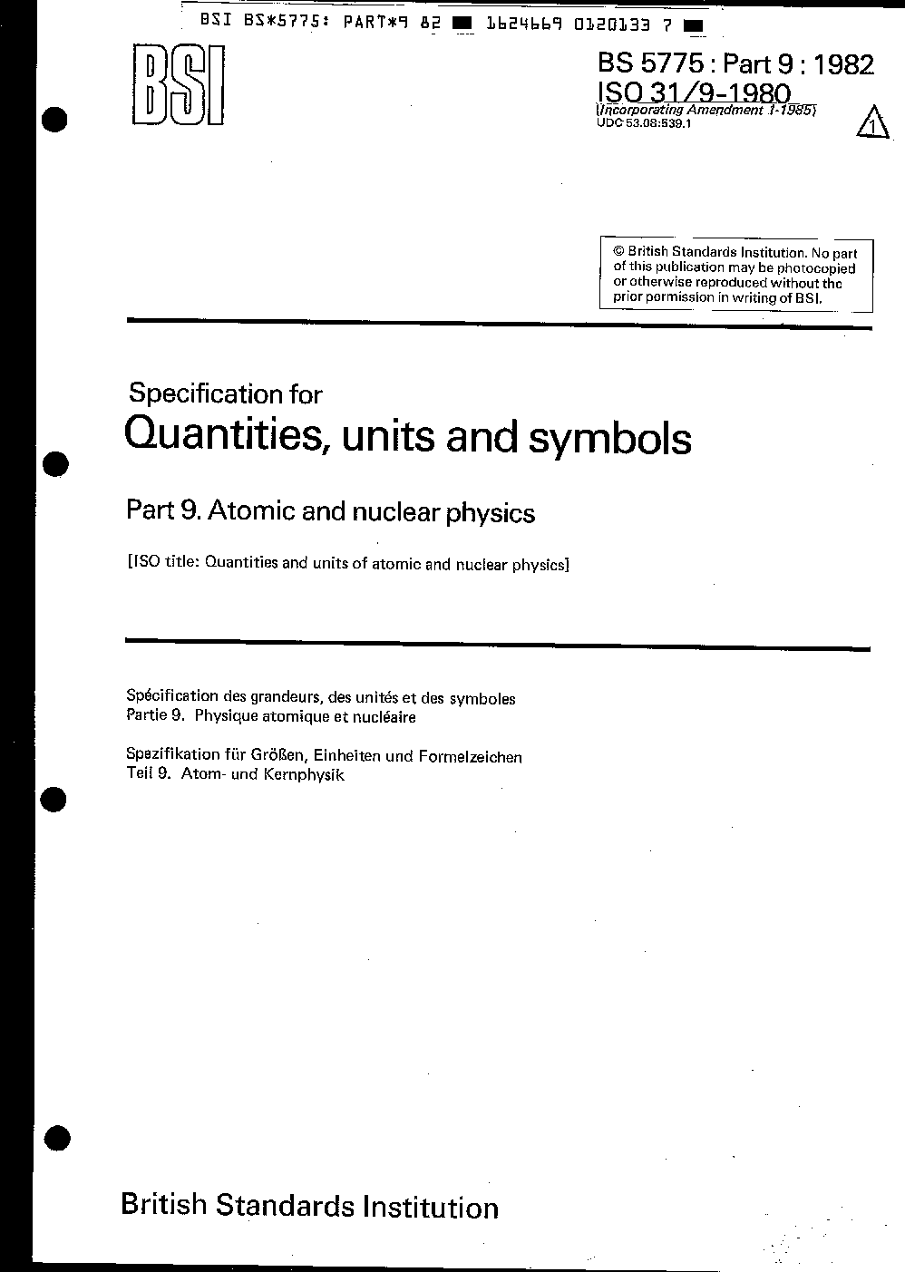 Specification for quantities, units and symbols Atomic nuclear physics
