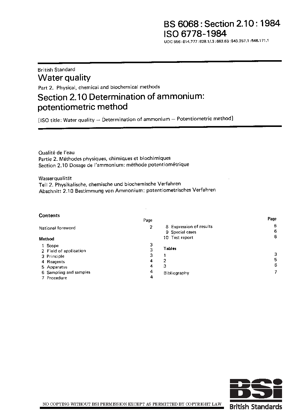 Water quality. Physical, chemical and biochemical methods Determination of ammonium: potentiometric method