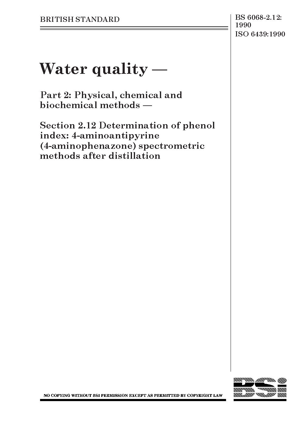 Water quality. Physical, chemical and biochemical methods Determination of phenol index: 4-aminoantipyrine (4-aminophenazone) spectrometric after distillation