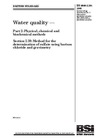 Water quality. Physical, chemical and biochemical methods Method for the determination of sulphate using barium chloride gravimetry