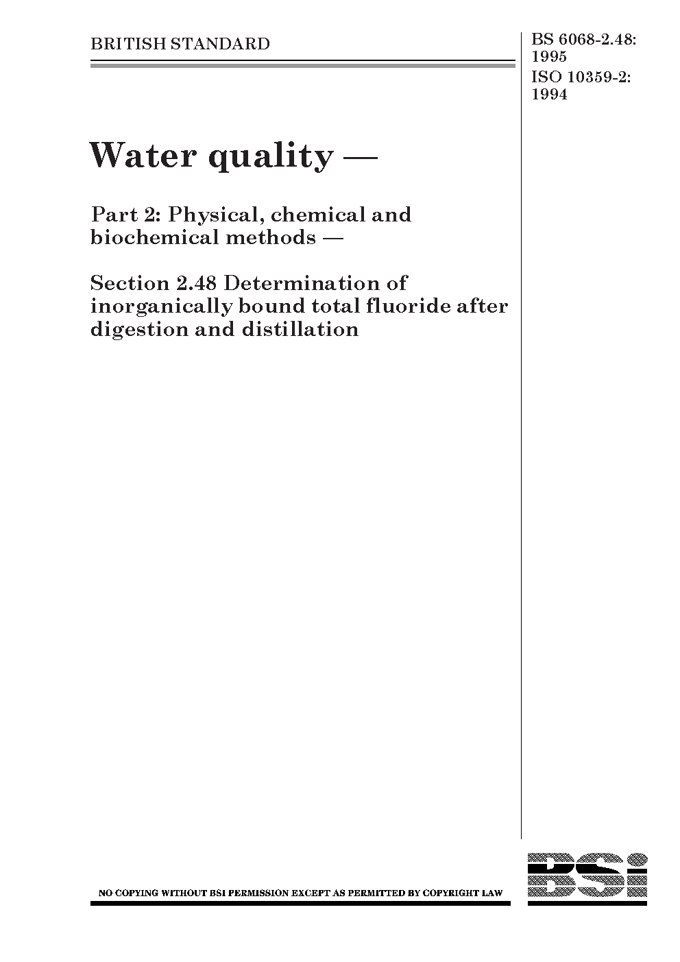 Water quality. Physical, chemical and biochemical methods Determination of inorganically bound total fluoride after digestion distillation
