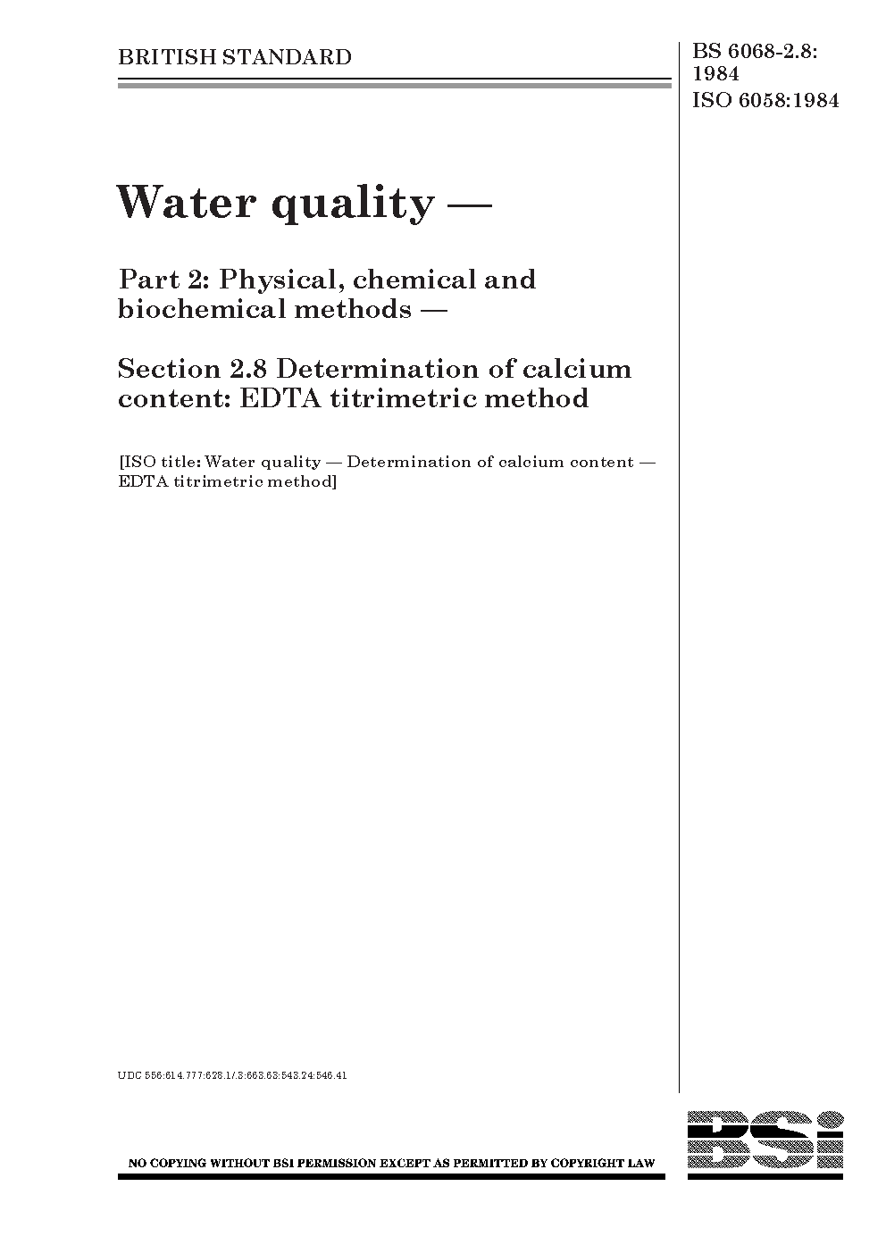 Water quality. Physical, chemical and biochemical methods Determination of calcium content: EDTA titrimetric method