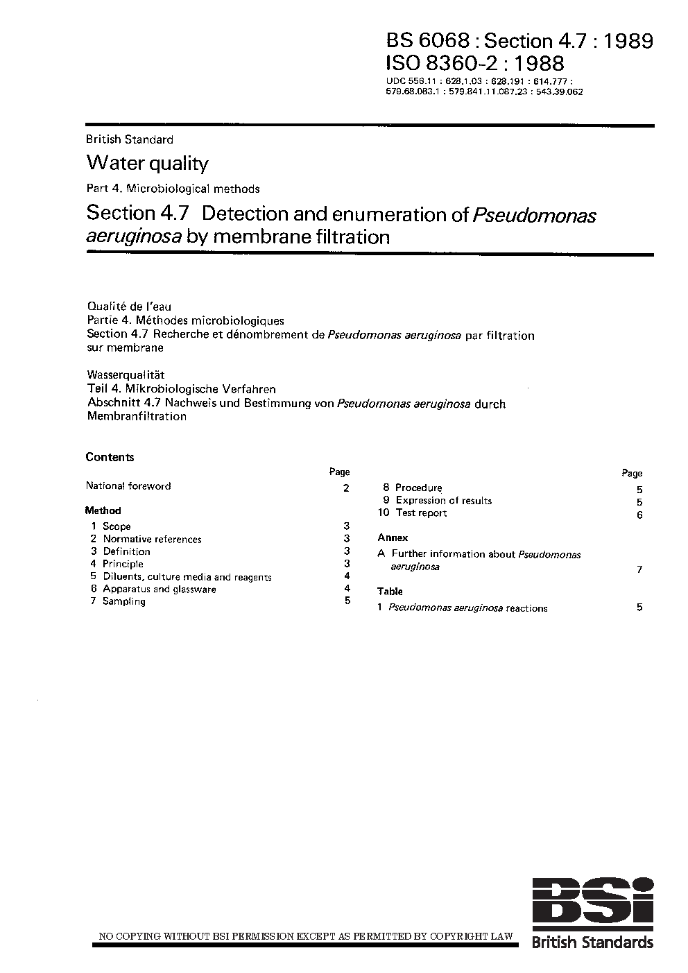 Water quality. Microbiological methods Detection and enumeration of Pseudomonas aeruginosa by membrane filtration