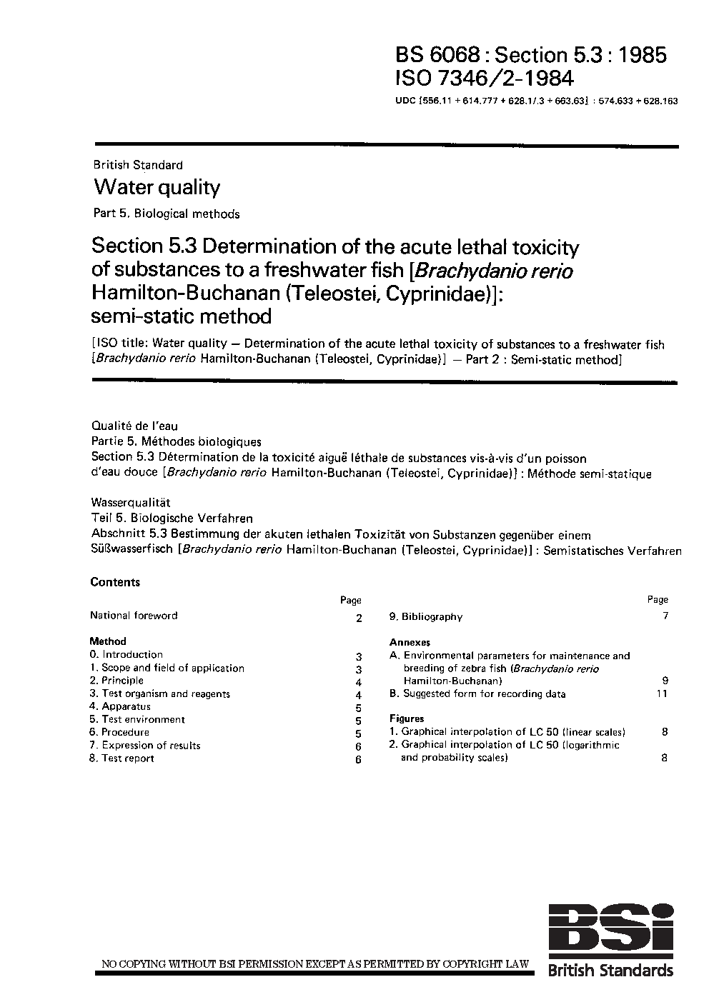Water quality. Biological methods Determination of the acute lethal toxicity substances to a freshwater fish [Brachydanio rerio Hamilton-Buchanan (Teleostei, Cyprinidae)]: semi-static method