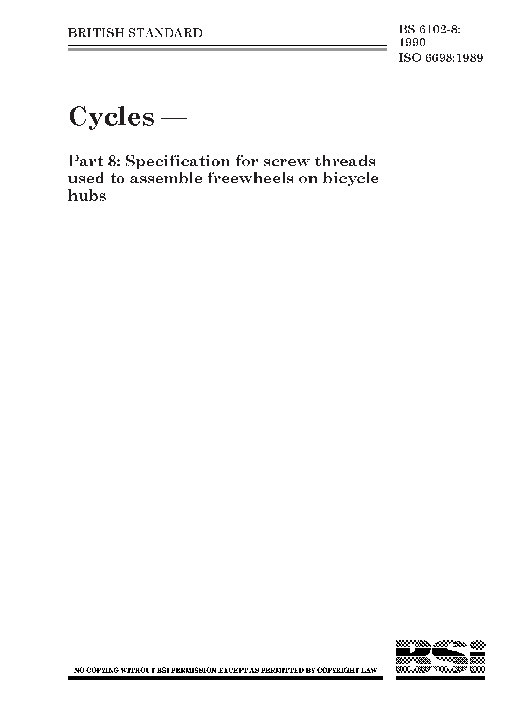 Cycles Specifications for screw threads used to assemble freewheels on bicycle hubs.