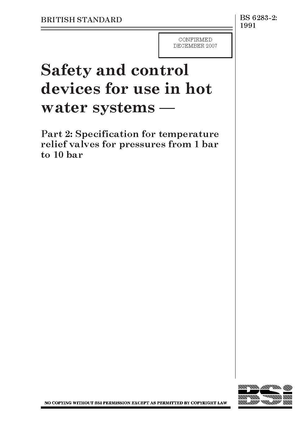 Safety and control devices for use in hot water systems Specifications temperature relief valves pressures from 1 bar to 10