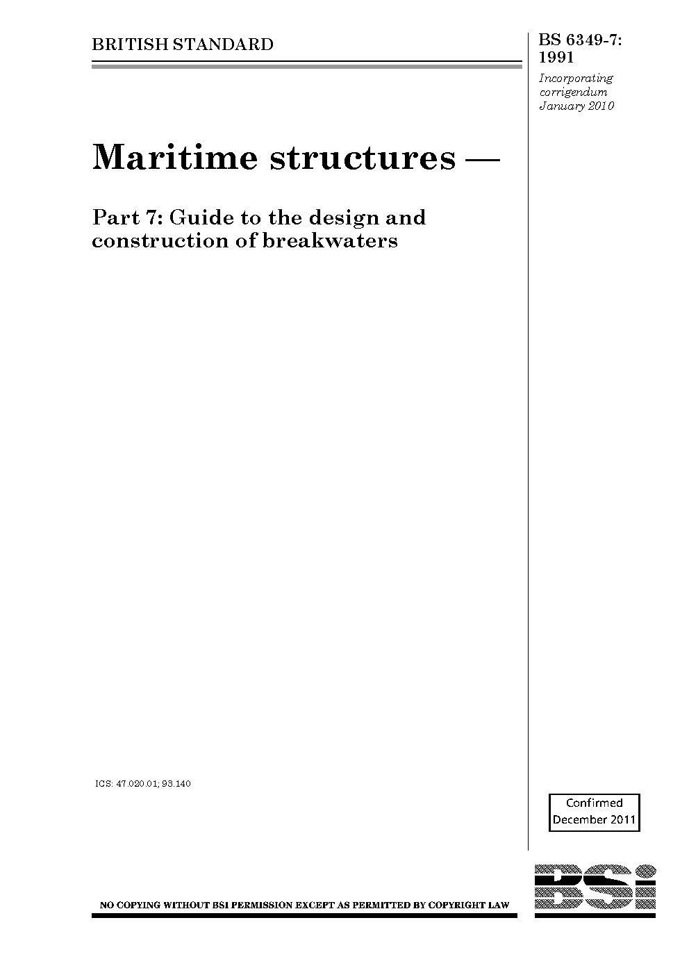 Design calculations;Bibliography;Foundations;Siting;Construction works;Construction materials;Structural failure;Maritime structures;Loading;Breakwaters;Formulae (mathematics);Harbours;Structures;Concretes;Quays;Design;Site investigations;Water retention and flow works;Caissons;Construction engineering works;Structural design;Rubble