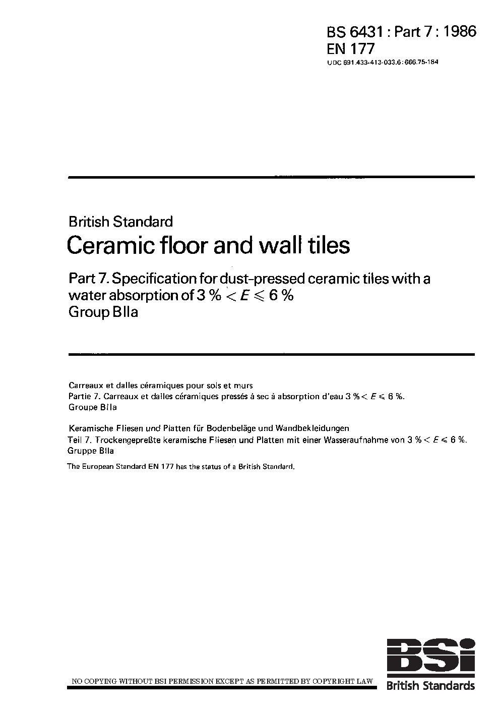 Ceramic floor and wall tiles Specification for dust-pressed ceramic with a water absorption of 3% < E = 6%. Group BIIa