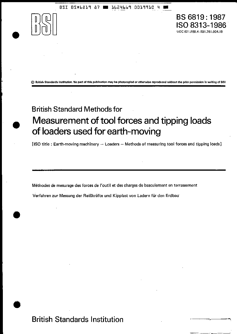 Testing earth-moving machinery Measurement of tool forces and tipping loads loaders