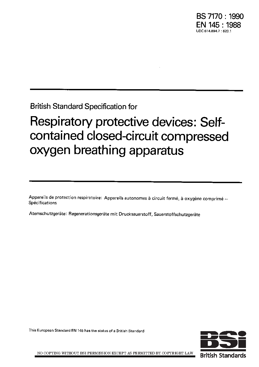 Specification for respiratory protective devices: self-contained closed-circuit compressed oxygen breathing apparatus