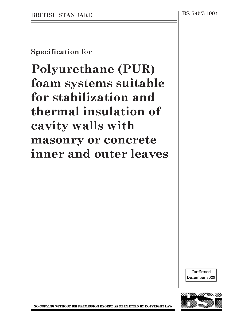 Specification for polyurethane (PUR) foam systems suitable for stabilization and thermal insulation of cavity walls with masonry or concrete inner and outer leaves
