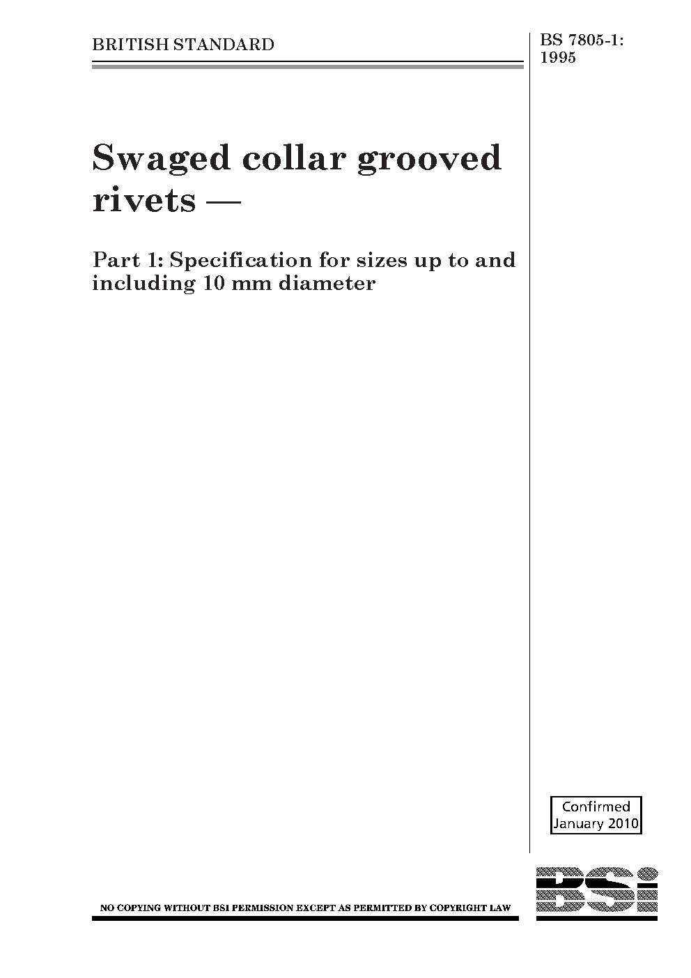Swaged collar grooved rivets Specification for sizes up to and including 10 mm diameter