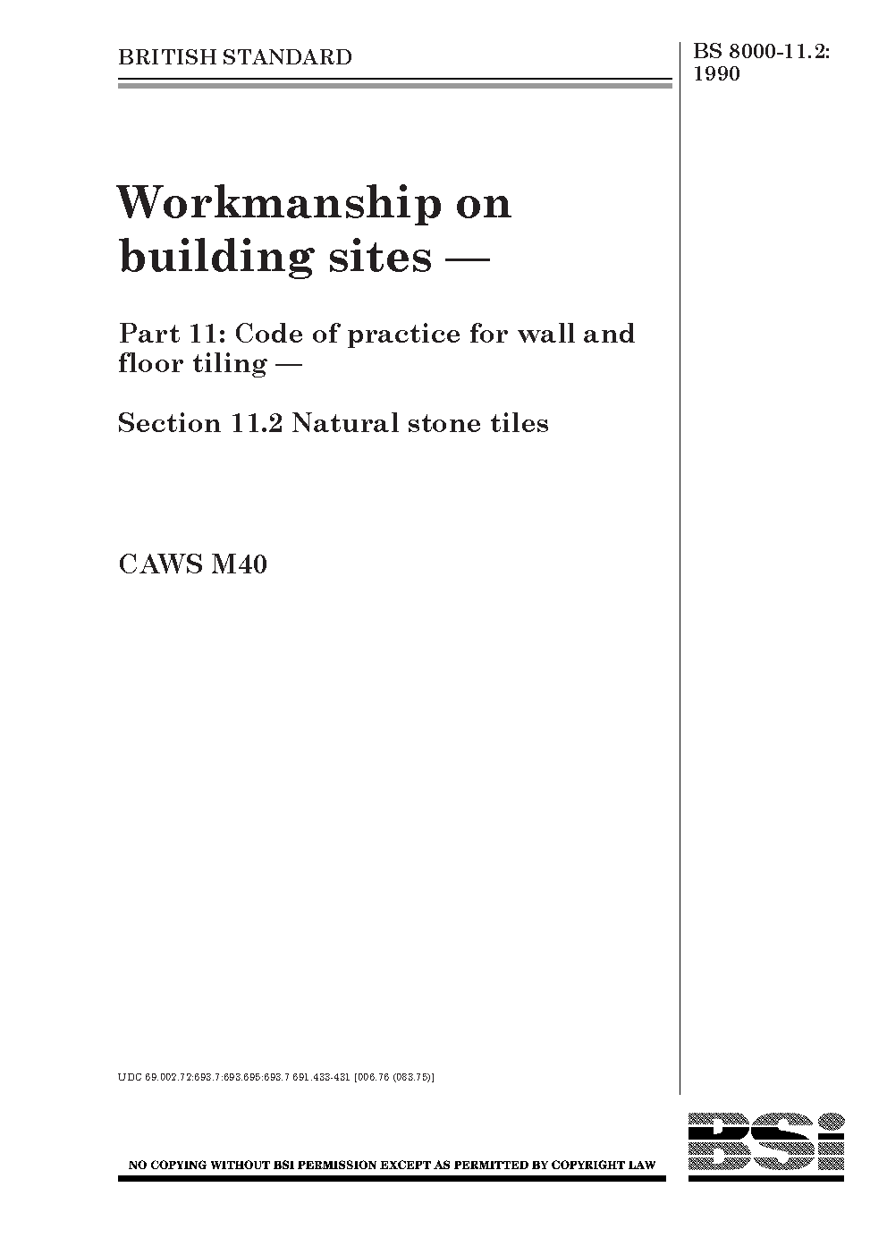 Workmanship on building sites. Code of practice for wall and floor tiling Natural stone tiles