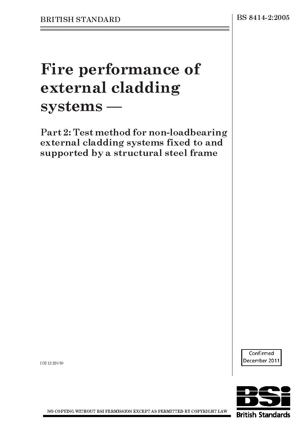 Fire performance of external cladding systems Test method for non-loadbearing fixed to and supported by a structural steel frame