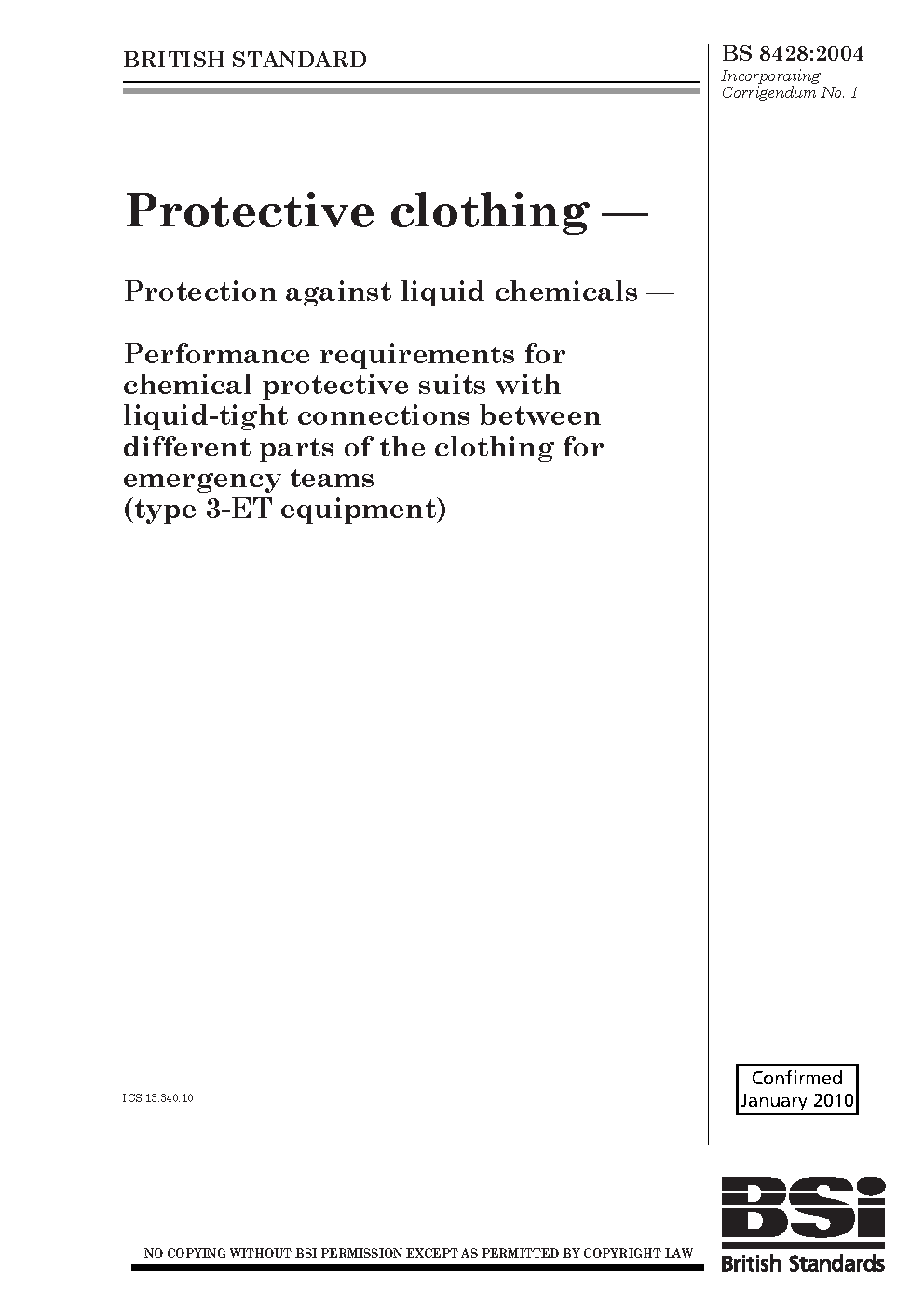 Protective clothing. Protection against liquid chemicals. Performance requirements for chemical protective suits with liquid-tight connections between different parts of the clothing for emergency teams (type 3-ET equipment)