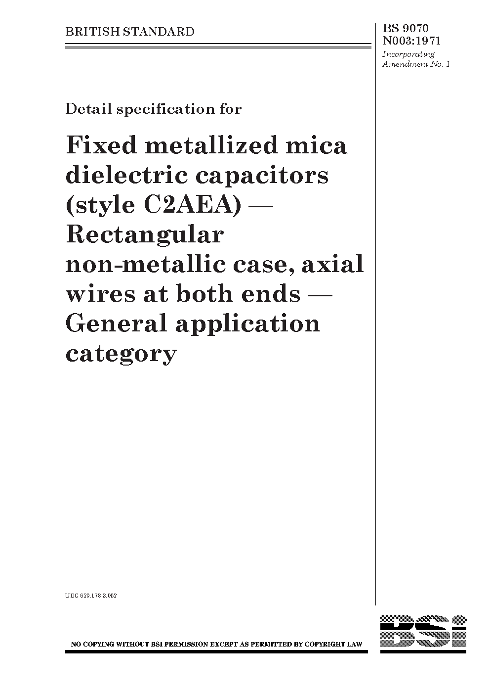 Detail specification for fixed metallized mica dielectric capacitors (style C2AEA). Rectangular non-metallic case, axial wires at both ends. General application category