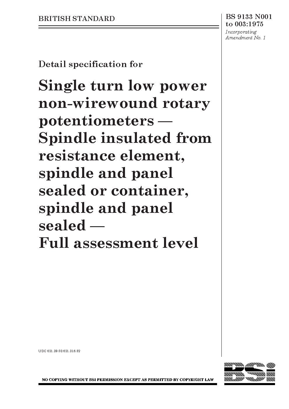 Detail specification for single turn low power non-wirewound rotary potentiometers. Spindle insulated from resistance element, spindle and panel sealed or container, spindle and panel sealed. Full assessment level
