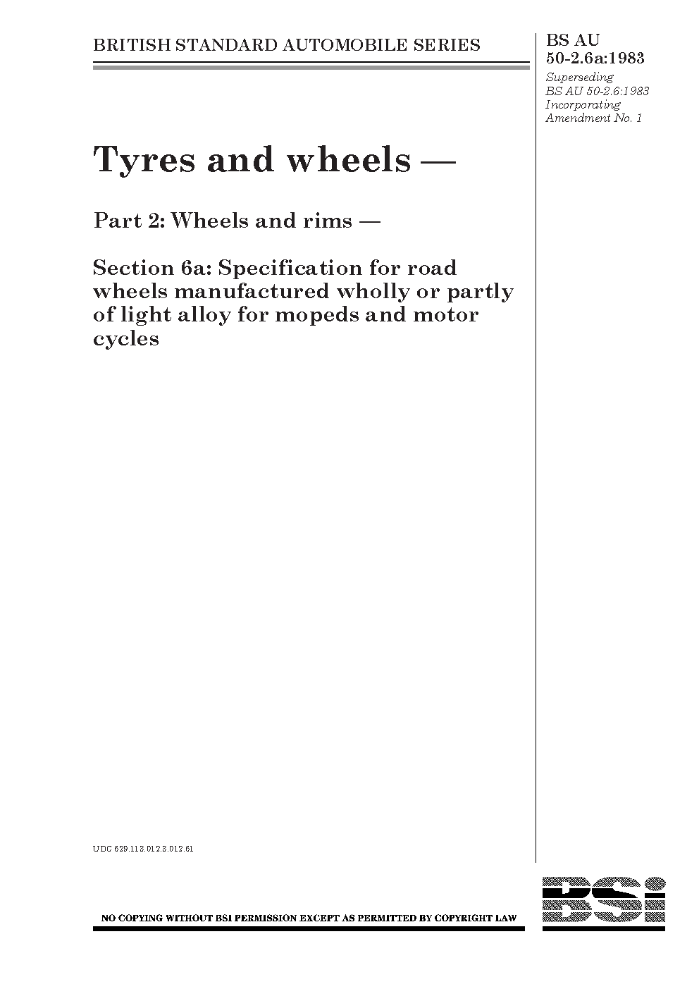 Impact testing;Tyres;Motor cycles;Bend testing;Light alloys;Cycle and motorcycle components;Wheels;Fatigue testing;Design;Road vehicle components;Mopeds;Performance testing;Vehicle components;Leak tests;Marking;Test equipment